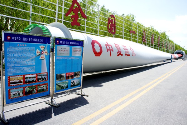 6月21日-22日,由省政府和中國國際貿易促進(jìn)委員會(huì )主辦的2013年中國(甘肅)國際新能源博覽會(huì )暨酒泉投資合作洽談會(huì )在酒泉市隆重舉行。中復連眾(酒泉)復合材料有限公司攜3MW-55米風(fēng)力機葉片亮相展會(huì )。